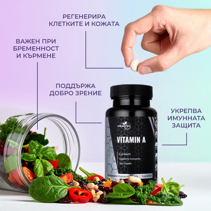 Витамин А е незаменим нутриент, който тялото ни не може да произвежда само, а модерната диета често не успява да достави достатъчни количества от него. Затова създадохме нашите дъвчащи таблетки - лесен и приятен начин да си набавите този ключов витамин. Формулата ни е обогатена с лиофилизирана дива боровинка, мощен антиоксидант за здравето на очите, и пребиотични фибри, които подпомагат усвояването. Това е една цялостна подкрепа за вашето зрение, имунитет и здравето на кожата.